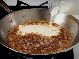 Coloque o creme de leite, o café expresso e deixe reduzir em fogo baixo.