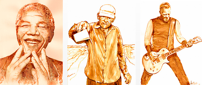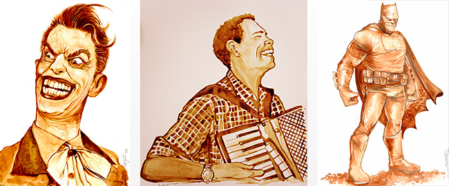 Ela pode até ser monocromática, mas nem por isso deixa de ser rica em detalhes: É assim que o designer Alex Souto descreve os desenhos que produz com café. Fã da bebida, o profissional resolveu fazer seus rabiscos cafeinados após ver trabalhos semelhantes: “Por ser uma técnica parecida com a aquarela, que é um dos estilos de pintura que mais aprecio, resolvi testar e me apaixonei”, conta. Hoje ele produz obras incríveis somente utilizando o líquido, que vão desde personagens de desenhos famosos até astros da música e do cinema.