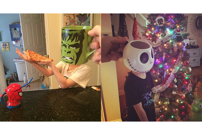 Curran possui uma coleção admirável de canecas e, para fazer as fotos, se preocupa em posicionar a porcelana de forma a esconder o rosto da criança. Separamos abaixo alguns dos nossos cliques prediletos: