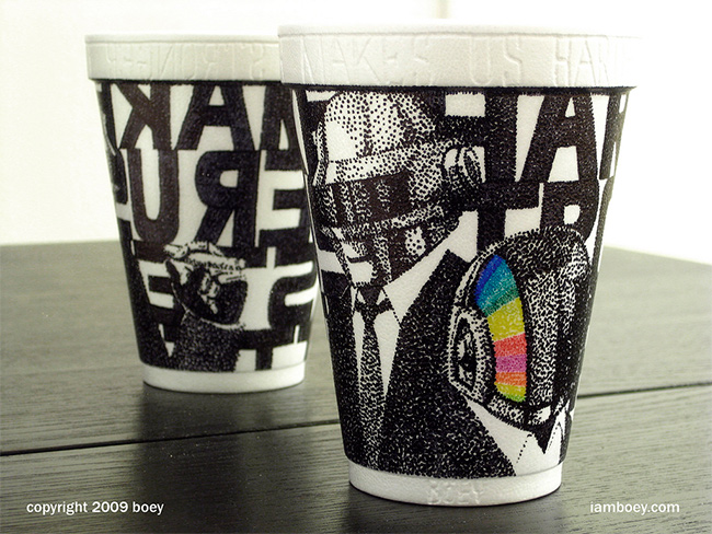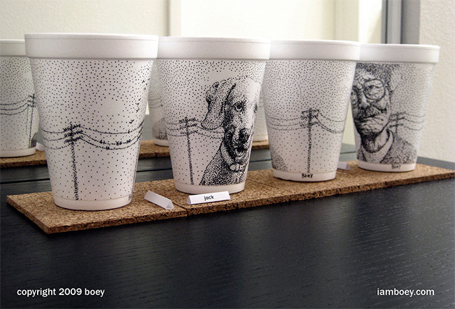 A equação é simples: copinhos de isopor que servem cafezinhos para viagem em padarias e cafeterias, uma caneta preta e muita criatividade. É assim que o animador e desenhista da Malásia, Cheeming Boey, faz para transformar copos de café em arte. Ele utiliza a superfície das peças para dar vida a desenhos diversos, dando uma nova perspectiva ao ato de degustar a bebida.
