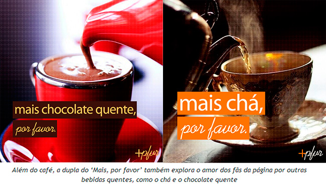 Como era de se esperar, seguindo essa lógica, a página possui o universo do café como assunto recorrente. “Essas postagens são sempre bem-sucedidas. Primeiro porque o brasileiro é notoriamente fã da bebida. Segundo porque o grão tornou-se uma ferramenta social, conforto após uma refeição, combustível para um dia puxado. É difícil encontrar quem não tome, especialmente no meio criativo”.