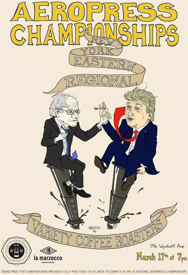 A imagem acima mostra o pôster nacional, que divulgou o encontro dos vencedores das etapas regionais em Atlanta. Abaixo, você confere o desenho da etapa Costa Leste, realizada em Nova York, que ironiza a atual batalha política nos EUA ilustrando os candidatos Donald Trump e Bernie Sanders:
