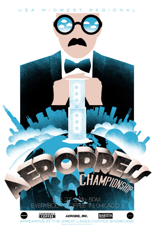 Realizado em Chicago, o encontro dos baristas do Centro Oeste foi em fevereiro e teve um pôster mais clássico, representando os prédios da windy city na ilustração: