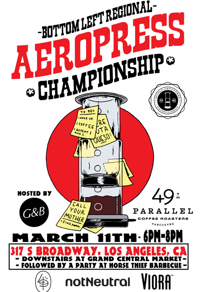 Já os representantes da Costa Oeste realizaram seu encontro em Los Angeles, e contaram com um pôster detalhista e recheado de post-its divertidos ao lado da Aeropress: