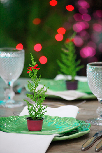 A dica da Denise é usar os pequenos pinheiros para decorar a mesa na hora da ceia – deixando os vasos sobre o prato de cada convidado.