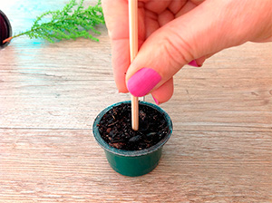 Com o auxílio de um espeto de madeira, abra um pequeno buraco no meio da terra.