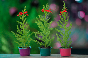 Com uma fita estreita, faça um pequeno laço no topo dos pinheirinhos.