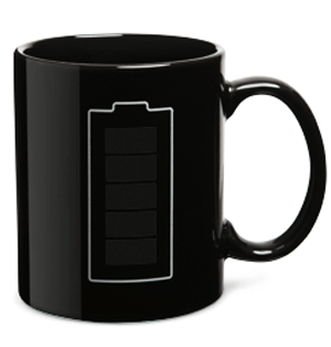 Battery Mug – Se sua energia está se esgotando, a solução é beber café! Essa caneca pode ser perfeita para essa ocasião. A proposta dela é imitar o mostrador de bateria de seu celular, para que você fique sabendo quando está na hora de “recarregar”. Nada de tomadas, ligue-se na cafeína!