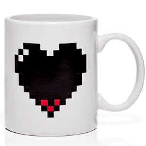 Pixel Heart – A porcelana traz um coração ao estilo geek de 8 bits vazio e sem vida. Ao preparar aquele café quentinho e completar a caneca, ele muda e fica vermelho e cheio de energia.