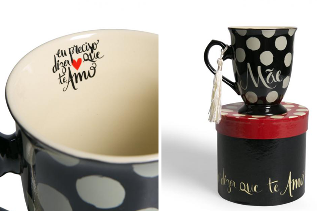 Se o orçamento de 2015 está baixo e você precisa de uma ideia diferente e especial, nossa dica é esta caneca fofa! Ela tem frases em homenagem à mamãe na parte interna e externa, além de um aplique decorativo na alça. Outro detalhe é a embalagem do presente, que combina com o poá da porcelana. O produto custa R$ 49,90 e pode ser seu aqui.