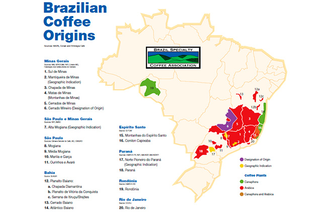 A BSCA consultou diversos órgãos federais e estaduais para delimitar por espécie de planta e por municípios as regiões produtoras. Entre elas, estão Minas Gerais (6), São Paulo (4), Bahia (3), Espírito Santo (2), Paraná (2), Rondônia (1) e Rio de Janeiro (1).