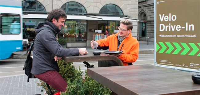 Todo mundo conhece o conceito de drive-in: você não precisa sair de seu veículo para consumir algo. Mas e quando o meio de transporte em questão é uma bicicleta e o tal produto é o café? A câmara municipal da cidade de Zurique, na Suíça, lançou o projeto Velokafi, que levará para diversas cafeterias da região duas estações de madeira feitas para que o cliente consuma a bebida sem mesmo descer da bike. Literalmente, uma pausa para o café.
