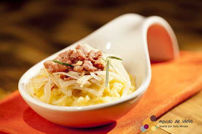 Esta versão funciona como uma entrada, mas pode também ser um prato principal, dependendo da quantidade. E quem quiser pode jogar um pouco de manteiga de garrafa por cima. Fica suntuoso.