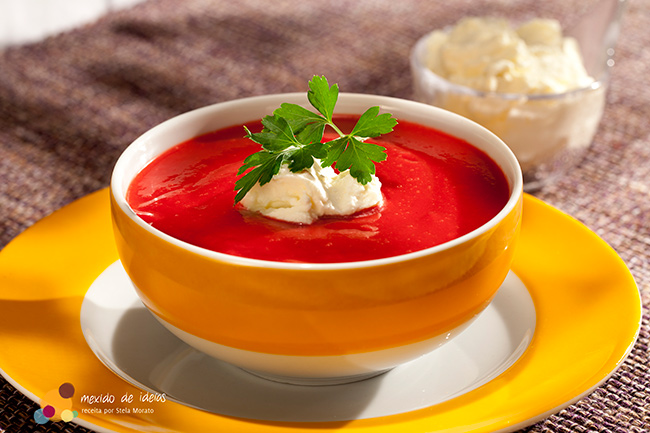Muitas vezes, encontramos o tomate como ingrediente principal. No entanto, a beterraba é a mais consagrada. O creme azedo (creme de leite fresco batido em forma de chantili com sal e suco de limão) é mais comumente adicionado quando ela é servida fria, mas também fica delicioso se derretendo em sua quentura.