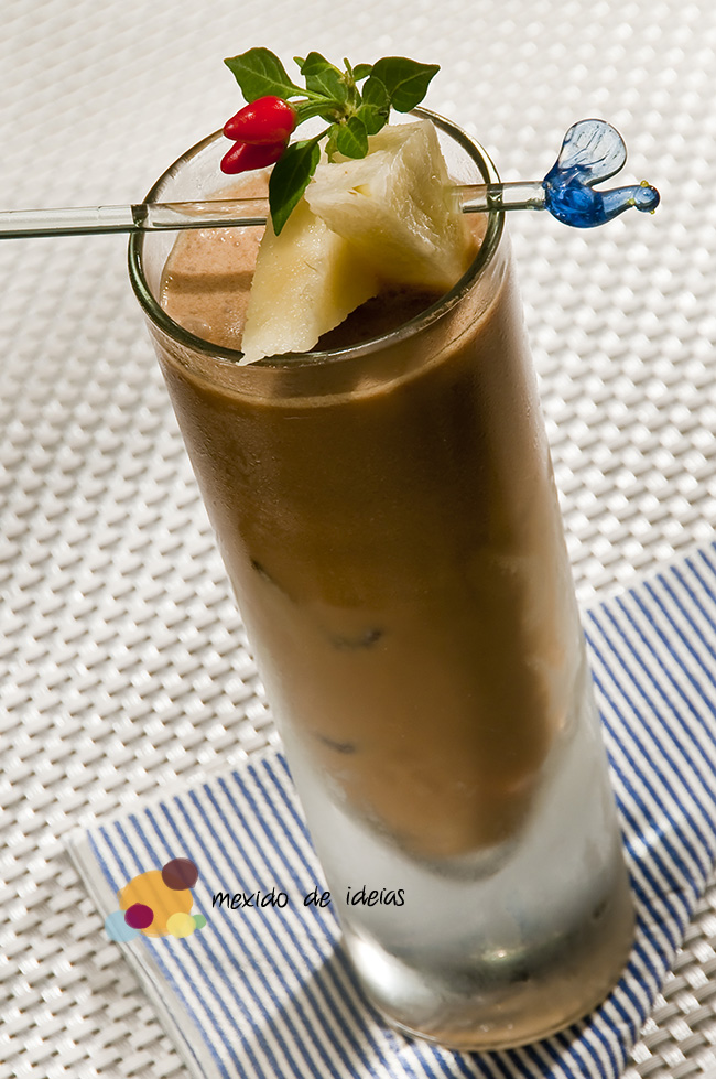 É uma Piña Colada, bebida originária de Porto Rico, que em espanhol significa abacaxi amassado, porém, aqui, com o toque do café. Da forma original, atrai o paladar de muita gente. Apostei no sabor do café para atrair ainda mais.