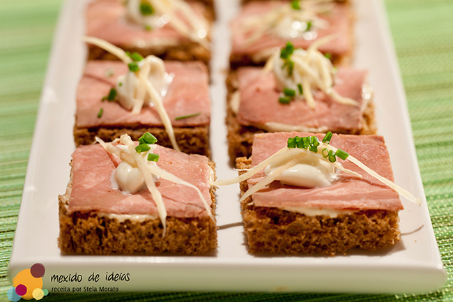 Cheguei, acabei de preparar meus canapés, colocando a gota de maionese e salpicando as cebolinhas que faltavam para completar o regalo.