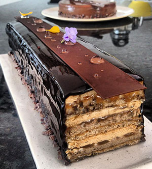 2- Aplique as camadas na sequência: biscuit de nozes, cremoso de café, crocante de arroz, caramelo semilíquido e mouse de caramelo e café.