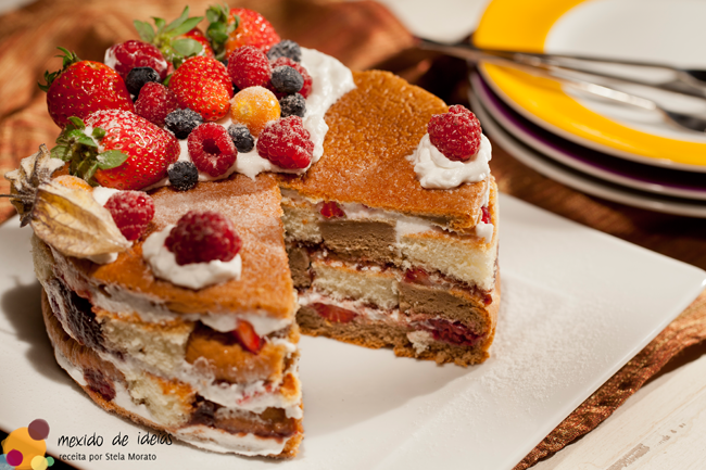 Deixe que a Carmem Miranda que mora em você assuma o controle na hora de montar este bolo. Parece complicado, mas não é. Você pode fazer o pão-de-ló com antecedência e só montar na hora de servir. Mamãe merece esse esplendor e glória da apoteose frutífera.