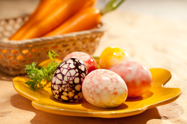 É possível também retirar alguns pedacinhos da casca do ovo antes de mergulhá-lo no Frisco. Assim, as partes sem a casca tomam a coloração. Sirva com cenouras cruas com a rama (folha). Se quiser, coloque um potinho com açúcar para as crianças salpicarem nos ovos.