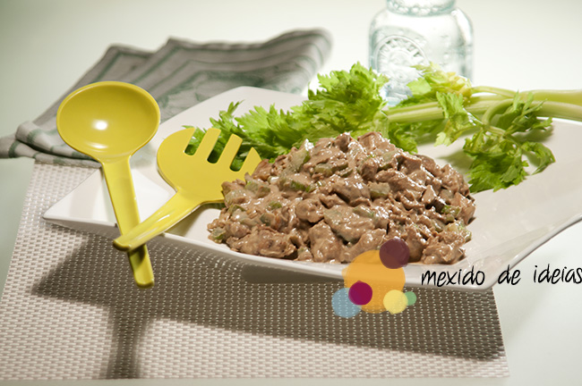 Folheando antigas receitas em revistas de culinária achei esta, que até parece um salpicão ou uma salada Waldorf*. Se você quiser, acrescente cubinhos de abacaxi na hora de servir. Ele irá contrastar muito bem com o gosto do café. Mas atenção! Coloque a fruta apenas na hora de servir, caso contrário, ele soltará liquido na salada.