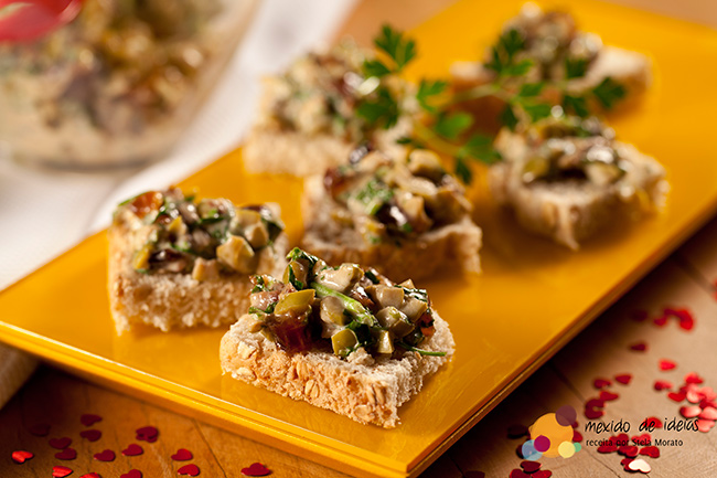 Tapenade é uma espécie de patê originário da Provance (sul da França). Em sua receita original, é feito com azeitonas pretas, anchovas, azeite e alcaparras. Macerado, tornou-se hoje uma “obra aberta”: cada um faz de seu jeito. Eu prefiro mais “pedaçudo” e picado, pois assim sinto o sabor de cada ingrediente.